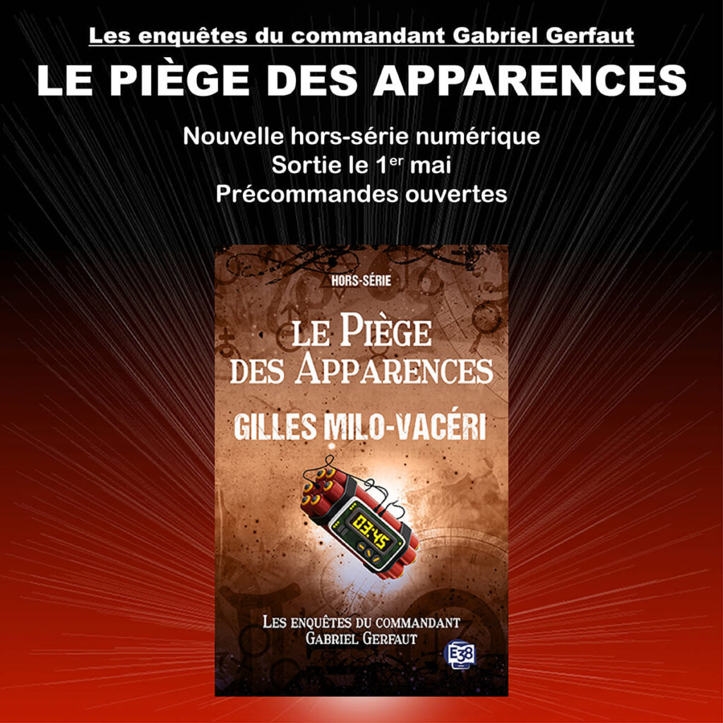 9 avril 2026 Gilles Milo-Vacéri LE PIÈGE DES APPARENCES, la prochaine enquête du commandant Gerfaut ! Je vous l’avais annoncé il y a peu et voici la petite surprise que je vous réservais. Une nouvelle numérique avec Gerfaut, histoire de vous faire patienter. Je vous explique tout ! ■ La genèse Certains d’entre vous se disent : Tiens ! Mais ce titre, ça me parle… et vous aurez raison. Cette nouvelle a déjà été publiée, mais peu diffusée, cette version est réécrite et a été quelque peu modifiée. Donc, de quoi faire plaisir aux fans du commandant ! ■ Et le tome XV, alors ? Je vous le dis tout de suite, vous allez attendre un peu plus que prévu. Pour des raisons techniques indépendantes de ma volonté, ce volume aura du retard. Les aléas du métier ! Mais rassurez-vous, vous pourrez le lire et vous ne serez pas déçu d’avoir attendu quelques semaines de plus. C’est promis. LE PIÈGE DES APPARENCES ■ les informations utiles ○ Titre : Le piège des apparences ○ Formats : Nouvelle / Exclusivement numérique ○ Sortie : Le 1 er mai 2026 ○ Précommandes ouvertes sur toutes les plateformes ○ Lien éditeur : https://www.editionsdu38.com/fr/policiers/634-le-piege-des-apparences-hors-serie.html Pensez à réserver votre exemplaire et avec un peu d’avance, je vous souhaite une belle lectureet de passer un bon moment avec ce cher Gabriel Gerfaut. ■ Résumé Le commandant Gabriel Gerfaut, profileur hors pair de la Criminelle, est arraché à une traque en cours pour une mission urgente à Toulouse : un groupe terroriste prépare un attentat, et les services de police piétinent. Pas de piste solide. Pas de localisation certaine. Une course contre la montre, un suspect en garde à vue… Gerfaut n’a que quelques heures pour le faire craquer, remonter la filière et empêcher l’irréparable. Mais quand l’assaut est lancé et qu’un fragment de preuve conduit les enquêteurs vers une nouvelle cible, l’évidence vacille. Et si le commandant Gerfaut, pour une fois, était victime d’une erreur d’interprétation ? Un texte court et efficace, une nouvelle policière entre antiterrorisme, manipulation psychologique et faux semblants. Laisser un commentaire Annuler la réponse Connexion en tant que WEB COM. Modifier votre profil. Se déconnecter ? Les champs obligatoires sont indiqués avec * Message*